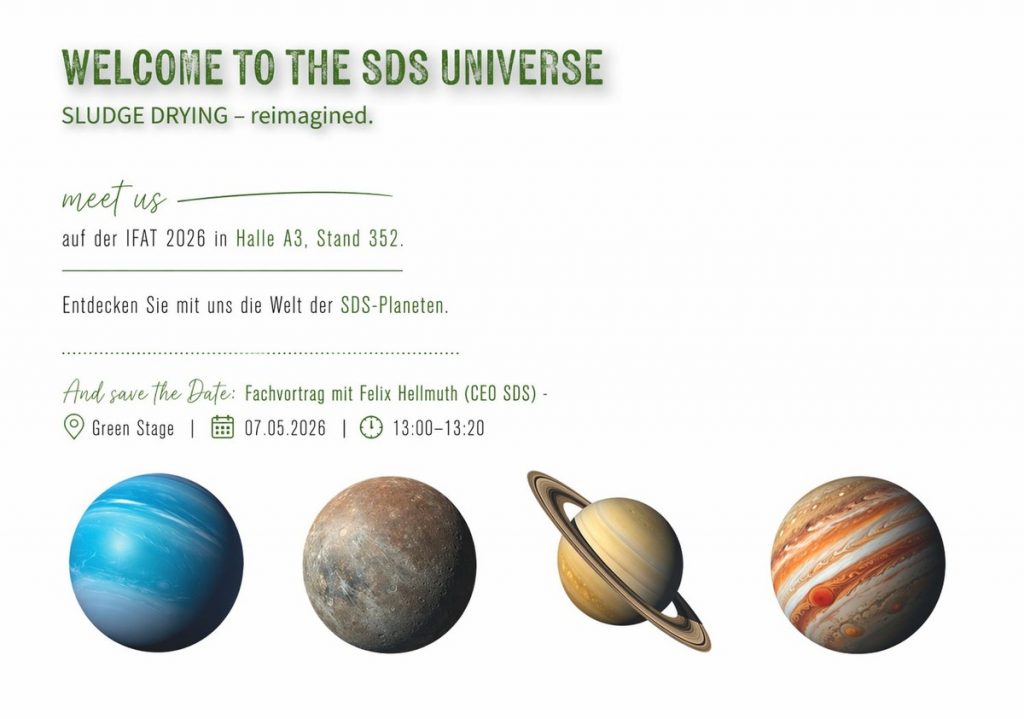 Besuchen Sie die SDS – michel gmbh auf der IFAT München von 4. bis 7. Mai und erleben Sie, wie moderne SDS-Schlammtrocknungsanlagen ohne aufwendige Infrastruktur neue Maßstäbe in Effizienz, Nachhaltigkeit und Wirtschaftlichkeit setzen.